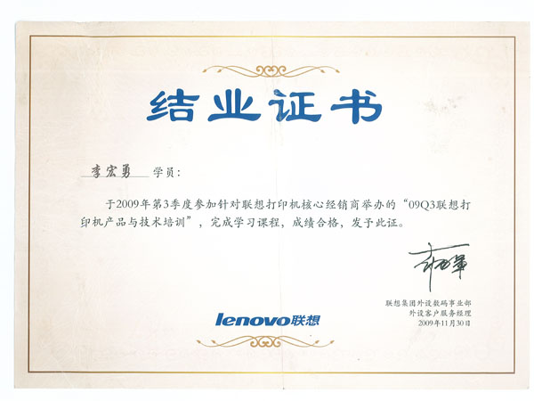 李宏勇 / 聯(lián)想打印機(jī)售后服務(wù)工程師